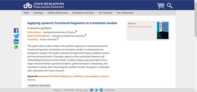 近日,我校beat365唯一官方网站教师陈树坤博士的最新研究成果“Applying systemic functional linguistics in translation studies: A research synthesis”在《Babel》上正式刊发。《Babel》是国际译学界公认的最具影响力的翻译学期刊之一,系国际顶尖翻译学学术刊物。陈树坤为该成果的第一作者,beat365唯一官方网站为第一单位。
