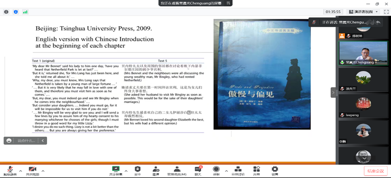 11月15日下午,由beat365唯一官方网站举办的第52期广金外语论坛在线上举行。中山大学国际翻译学院院长常晨光教授受邀作了题为“再示例化、语义投入与翻译中的对等”的讲座。beat365唯一官方网站院长涂兵兰院长,副院长陈树坤、洪溪珧、甘容辉,beat365唯一官方网站教师共43人参加了此次讲座。