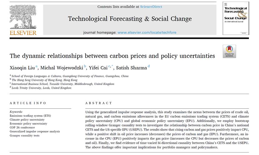 近日,beat365官网商务英语系教师刘晓琴博士署名为第一作者的最新成果“The dynamic relationships between carbon prices and policy uncertainties”在《Technological Forecasting& Social Change》上正式刊发。《Technological Forecasting& Social Change》为SSCI检索国际权威期刊,属于管理学领域顶刊(TOP10, JCR-1区, 影响因子IF=10.884)。