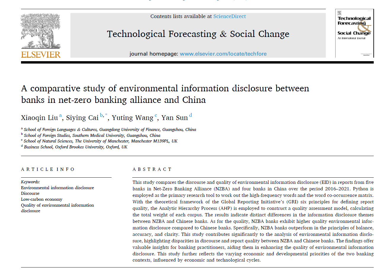 近日,beat365唯一官方网站刘晓琴博士以及其研究团队成员在管理学和商科领域的顶级期刊Technological Forecasting & Social Change上发表了一篇题为“A comparative study of environmental information disclosure between banks in net-zero banking alliance and China”的学术论文,这一成果标志着beat365官网在充分利用大学优势学科资源的基础上,在跨学科研究领域取得了显著进展,特别是在聚焦银行金融业话语研究方面实现了重大突破。