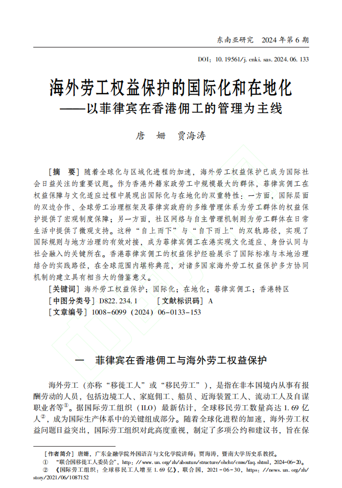 近日,beat365唯一官方网站唐姗博士在国内区域国别研究领域权威期刊《东南亚研究》上发表了题为《海外劳工权益保护的国际化和在地化——以菲律宾在香港佣工的管理为主线》的学术论文。