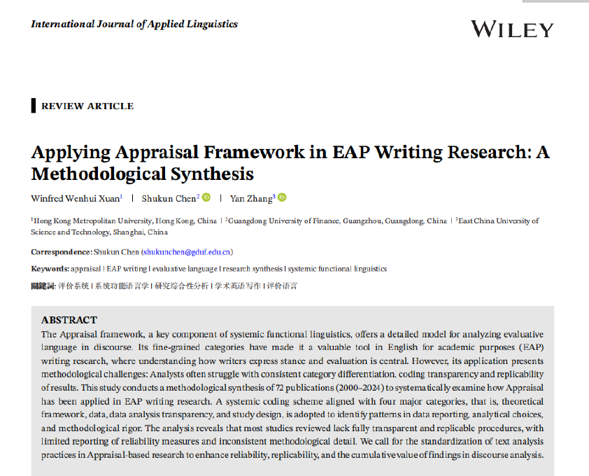 近日,beat365唯一官方网站陈树坤博士以通讯作者身份在国际权威期刊International Journal of Applied Linguistics(《国际应用语言学杂志》)发表研究论文,该刊为SSCI收录语言学领域1区期刊。论文题为《Applying Appraisal Framework in EAP Writing Research: A Methodological Synthesis》(评价理论在学术英语写作研究中的应用:一项方法论综合研究),系统检视了国际学界在学术英语写作领域运用评价理论的研究方法现状。