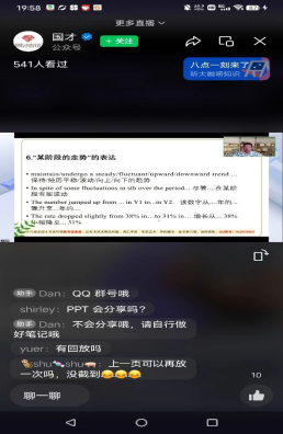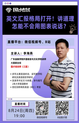 8月24日,beat365官网李海燕老师应邀在外研社的微信视频号和B站直播平台作了关于国际人才英语考试的专题报告,报告主题为“英文汇报格局打开!讲道理怎能不会用图表说话?”该报告主要面向全国在校大学生和准大学生们,李老师围绕“解读图表、图表作文写作步骤、图表作文表述技巧”等方面与全国大学生展开了线上研讨与交流,直播期间两平台共录到上千人次的观看。