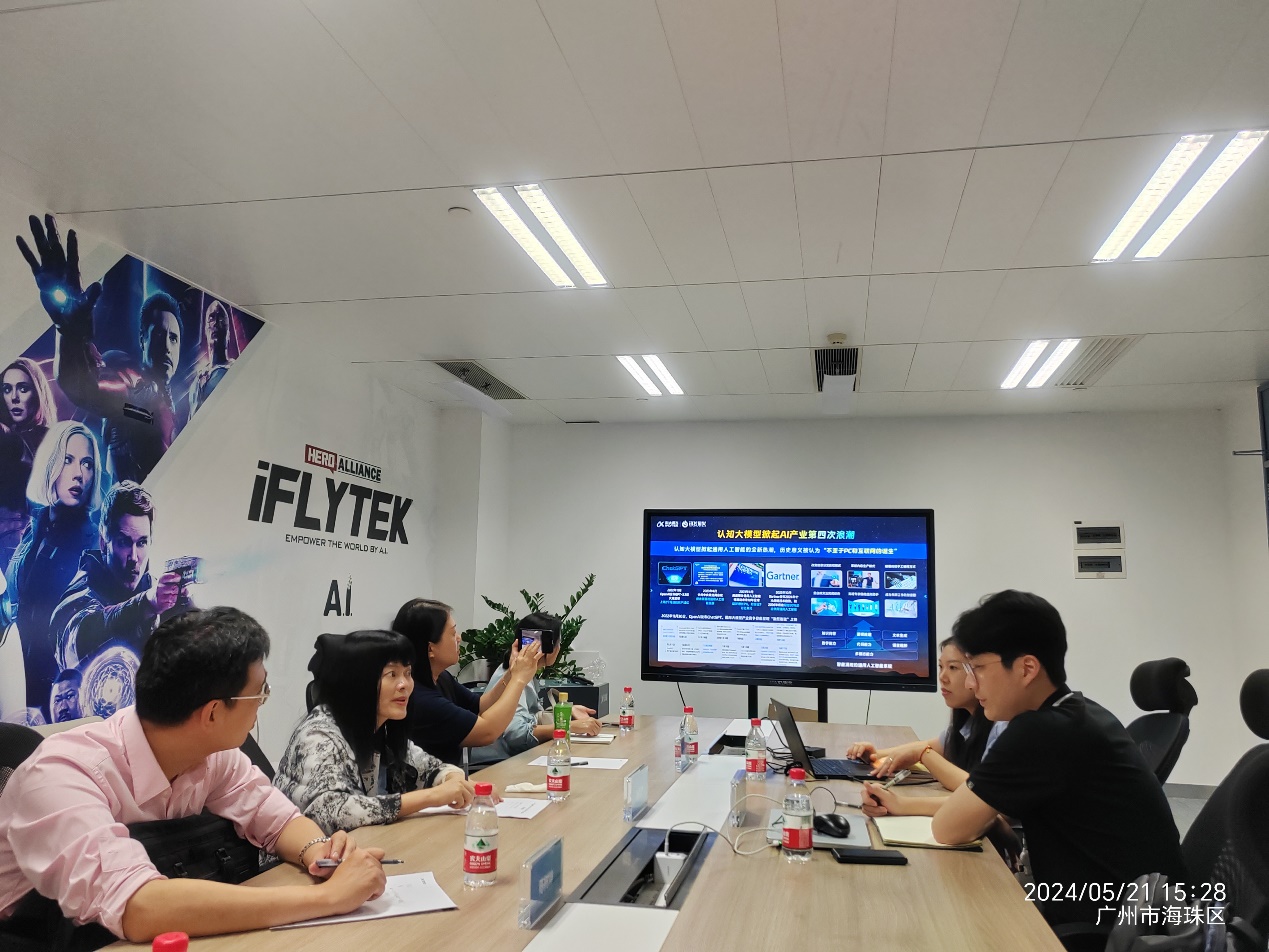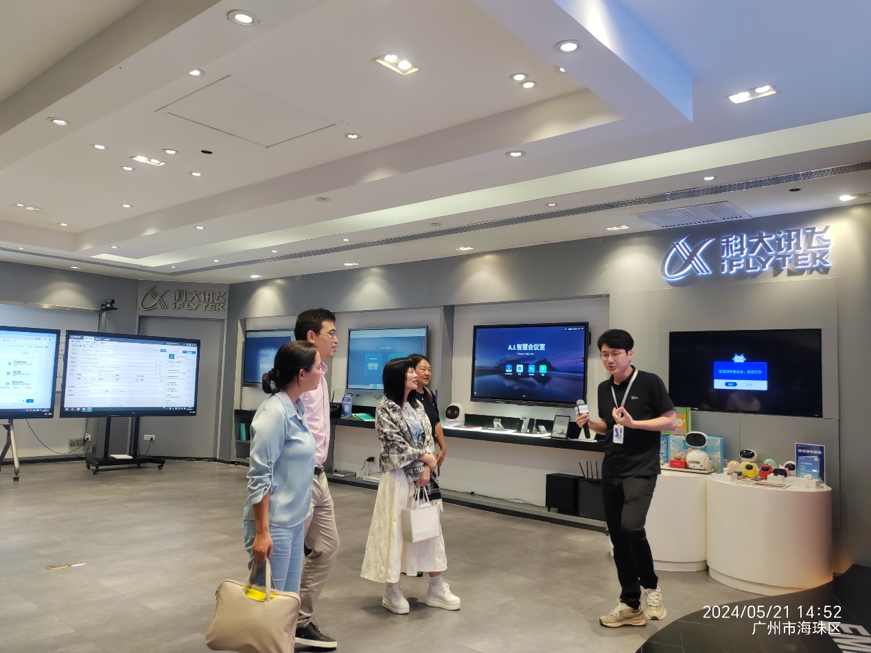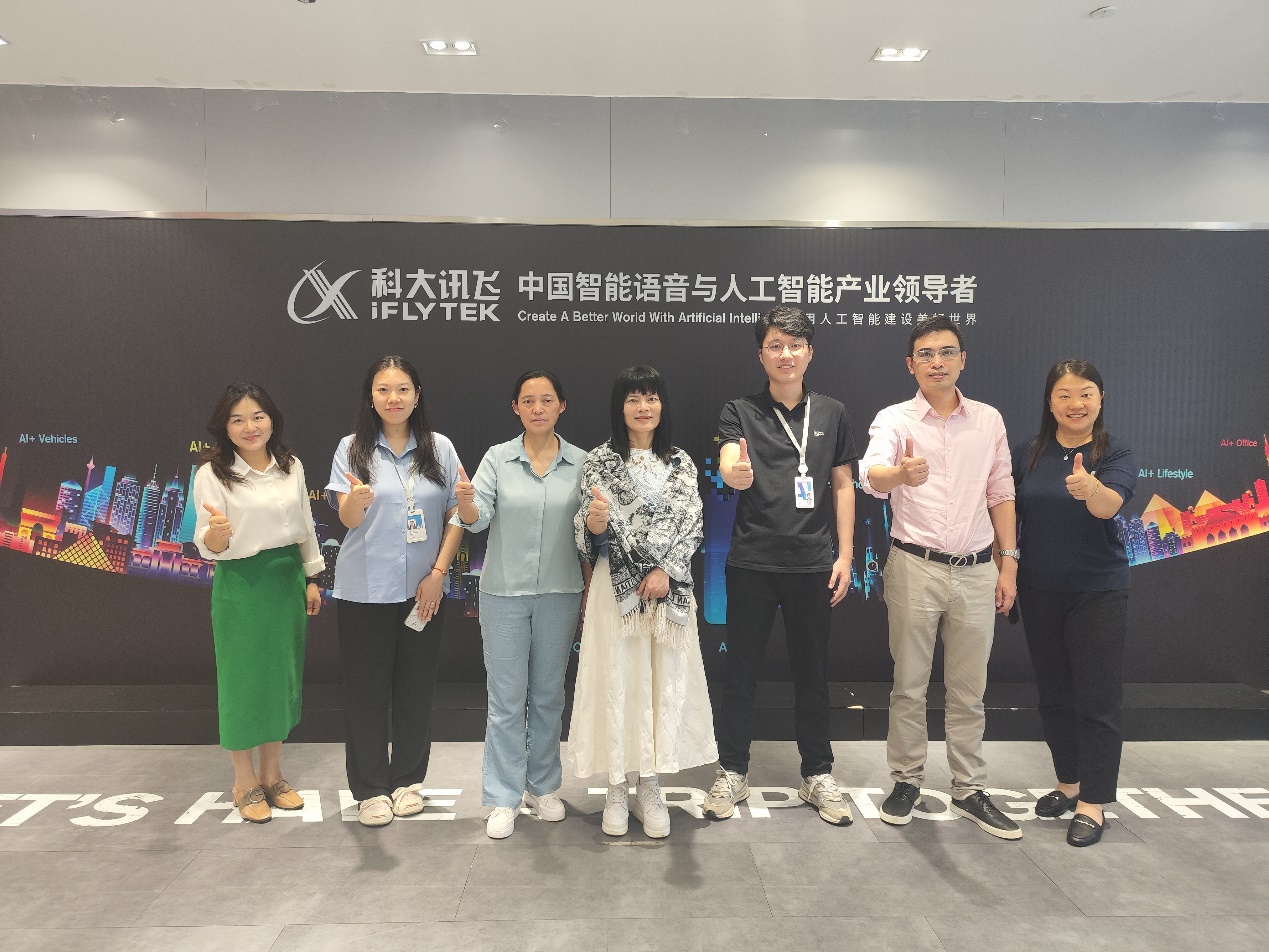 为加强学院与企业间的交流与合作,探索产教融合新模式,为学生提供更多实践机会,促进学生高质量就业,共同推动外语教育与人工智能技术的融合发展。5月21日下午,beat365唯一官方网站涂兵兰院长率领导班子一行访问科大讯飞华南有限公司国际媒体港总部,进行了一次深入的访企拓岗活动。本次访问团由涂兵兰院长、甘容辉副院长、陈树坤副院长、英语系主任毕亚男以及翻译系主任邓薇组成,科大讯飞高教行业高级客户经理张宇哲和高级咨询经理莫宇热情接待。