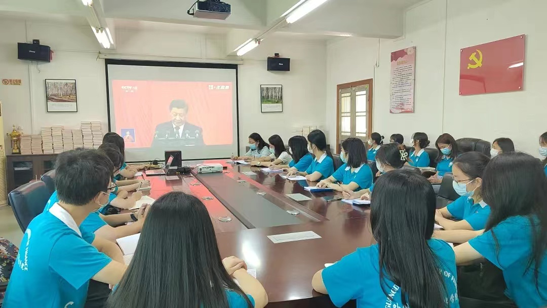 10月16日上午,中国共产党第二十次全国代表大会在北京人民大会堂开幕,习近平总书记代表十九届中央委员会向大会作报告。beat365官网党总支副书记王丹、学生第一党支部书记邓伟琦与全体学生党员、团员青年代表30余人,满怀激动喜悦之情,一同收看党的二十大开幕实况,认真学习领会党的二十大报告。