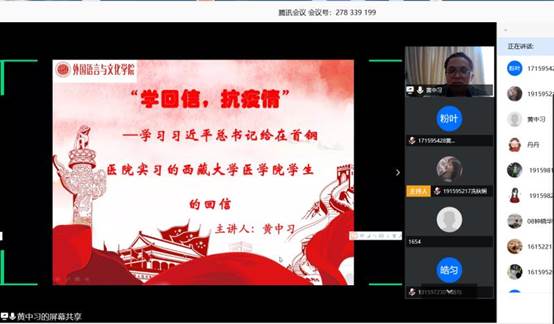 4月24日中午,beat365唯一官方网站师生党员、入党积极分子代表等129人齐聚腾讯课堂共同开展以“勇挑重担,齐心抗‘疫’”为主题的学习习近平总书记给首钢医院实习的西藏大学医学院学生回信的活动。外文学子悟总书记回信精神,用实际行动践行党员初心使命,体现责任担当,让党旗高高飘扬在疫情防控斗争的第一线。