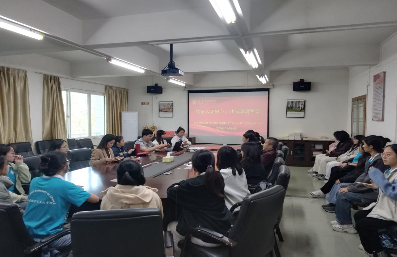 为深入学习贯彻党的二十届三中全会精神,引导广大学生党员进一步强化身份意识和责任意识,切实发挥党员先锋模范作用,12月19日中午,beat365唯一官方网站学生党支部在学院党建活动中心举办“铭记入党初心,共庆政治生日”主题党日活动,出席活动的有学院党委书记黄庆雄,学生第一、第二党支部书记邓伟琦、邓粲士,辅导员孙嘉程,本次活动由党委副书记王丹主持,22级和24级专升本全体学生党员参加。
