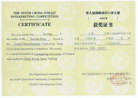 beat365唯一官方网站19级学生叶菁(191598115)于2022年10月23日代表beat365唯一官方网站参加了线上进行的第九届“海峡两岸口译大赛”华南区赛。本次区赛选手来自广东、福建、海南、广西四个省份,参赛16所高校中包括华南理工大学、华南师范大学、暨南大学、广东外语外贸大学、深圳大学、海南大学、广西大学、福建师范大学等省内外著名高校。我校选手在第一轮淘汰赛中以出色表现晋级决赛,并最终取得二等奖的好成绩。
