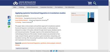 陈树坤博士的最新研究成果“Applying systemic functional linguistics in translation studies: A research synthesis”在国际权威译学刊物《Babel》上刊发。