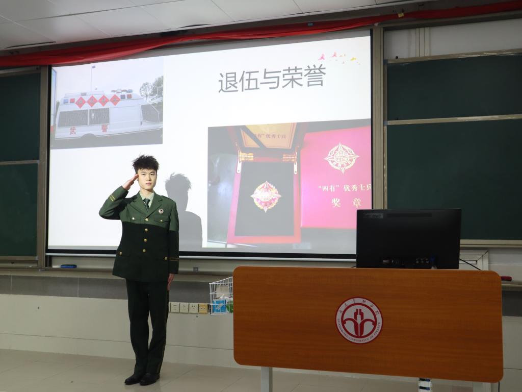 会上,退役士兵黄俊麒、李浩棚和区文彦同学分别结合自身的军旅生涯展开分享。从入伍前的准备工作到服役时的体能训练与理论学习,从与战友们共度的温馨时光到自身素质的提高和精神的蜕变,三位同学声请并茂的演讲瞬间把与会同学带到了军营生活。