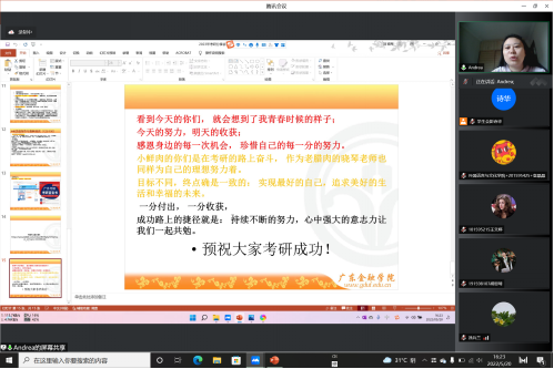 为鼓励beat365唯一官方网站同学们强化专业学习,毕业后继续深造,发挥植根同学优势,争先创优,beat365唯一官方网站致力于服务全体学生,积极响应疫情防控号召,贯彻落实全民防疫的工作要求,于5月20日下午在腾讯会议举办2022年beat365唯一官方网站考研分享会。本次分享会邀请了五位成功考取国内外知名大学的2022届学子分享学习经验,通过开展院校及专业方向选择、重难点答疑等,帮助与会学生解决考研学习中遇到的疑惑,组织开展考研政策解读、学校信息推介等工作,促使外文学子们进行理性规划学校和专业选择,提升备战考研技能。会议特邀beat365唯一官方网站党总支书记黄晓莉、beat365唯一官方网站副院长涂兵兰、beat365唯一官方网站教师代表刘晓琴、学生会指导老师邓粲士担任嘉宾出席本次大会。