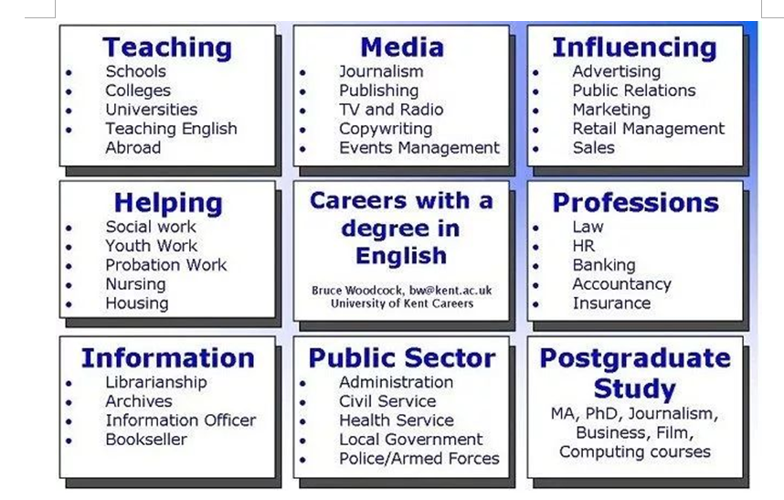 Here we will discover what can we do with a degree in English. The great flexibility of getting a degree in English help us enter a wide range of careers. During our four yeas study, we actually develop a wide range of skills. We are able to think independently, to summarise and precis, to present information effectively and to give a confident presentation. Meanwhile, we can get most of these abilities into our CV.