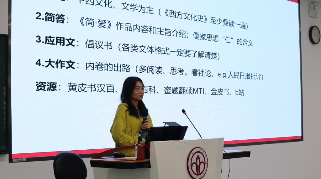 随后,4名2023届毕业生分别从考研流程、院校选择、学习规划、备考策略、就业选择等方面向同学们分享宝贵的个人经历。她们分别是上岸对外经济贸易大学英语口译专业的叶菁,分享了自己在专业选择、院校选择方面的经验;上岸华南师范大学学科英语专业的姚霖雯,介绍了在考研期间的学习资料和备考方法;上岸世界百强名校利兹大学的唐睿,建议同学们平时要提高听课质量,重视绩点的提高,积极参与各类实践和比赛活动,积累经验;考研虽未上岸但已成功入职的吴榮汾,分享了她的考研经历以及择业之路,完美地诠释了“人生道路不止一条,不断打磨自己和做好规划才是成长的必由之路”的道理。