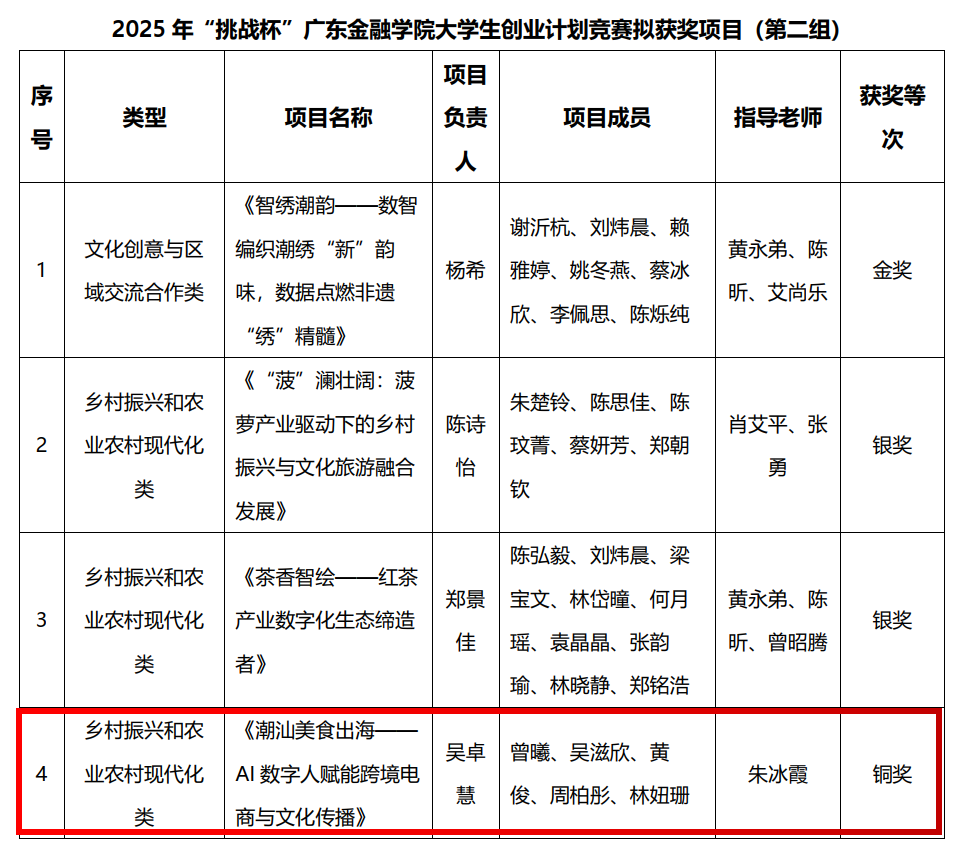在2025 年 “挑战杯” beat365唯一官方网站大学生创业计划竞赛中,beat365官网朱冰霞老师指导的学生团队凭借《潮汕美食出海——AI 数字人赋能跨境电商与文化传播》项目,获乡村振兴和农业农村现代化类校赛铜奖,成功晋级参与省级比赛,彰显beat365官网创新创业教育的持续进步。