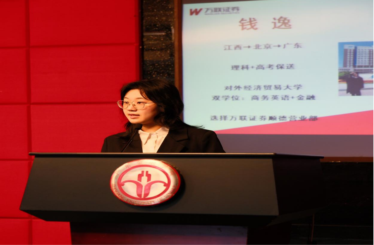 随后,万联证券资深财务顾问钱逸结合自身从外语专业毕业生转型为金融行业从业者的成长经历,为同学们带来一堂生动实用的职业规划课,她分享了外语人才在金融领域的发展优势,鼓励同学们发挥语言特长,主动拓展金融、经济等相关知识,打造“英语+金融”的复合型能力结构。她的讲述贴近实际、富有感染力,激发了在场同学对未来职业发展的深入思考。