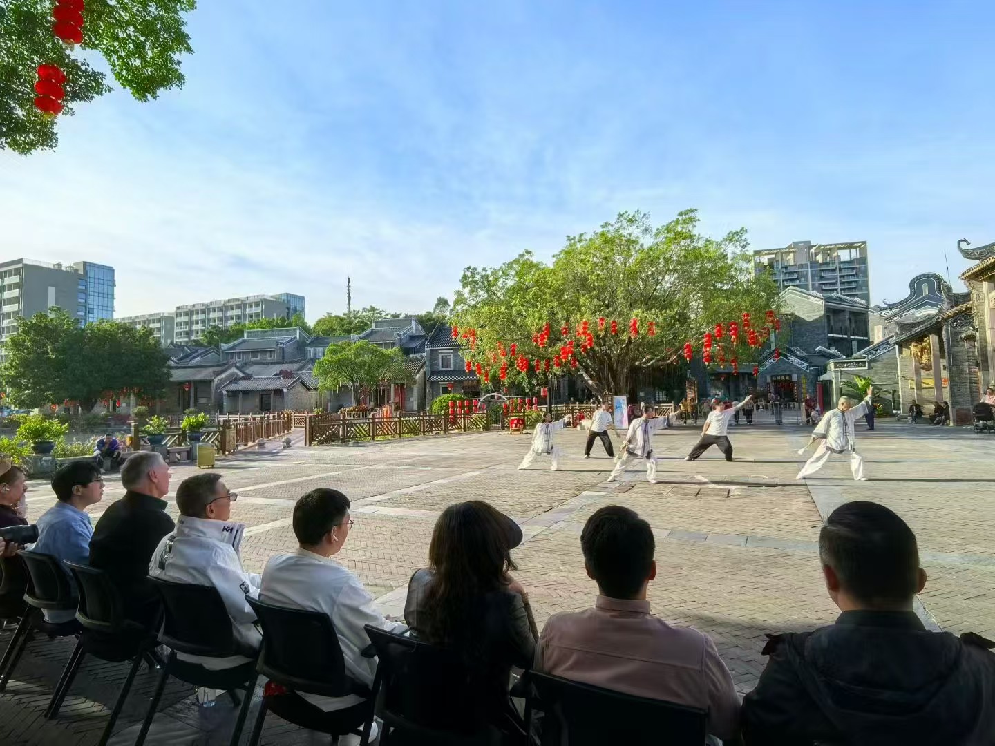 活动期间,安东尼·埃德加与广东省武术协会领导等一行人先后走访了均安牛仔城、李小龙乐园、岭南印象园、广东商学院等多地,实地探访牛仔产业全链条,体验功夫学堂、观摩太极展演、观看醒狮功夫秀与李小龙诞辰85周年纪念演出,参观李小龙纪念馆、淡隐霍公祠及非遗展示区,深入了解岭南产业特色、民俗文化、建筑底蕴与非遗技艺。此外,还举行了“武术文化国际传播”专题座谈会及岑能大师诞辰百年纪念活动,围绕武术传承与国际传播等议题交流。许浩哲全程负责翻译工作,保障跨文化交流与研讨顺畅推进。