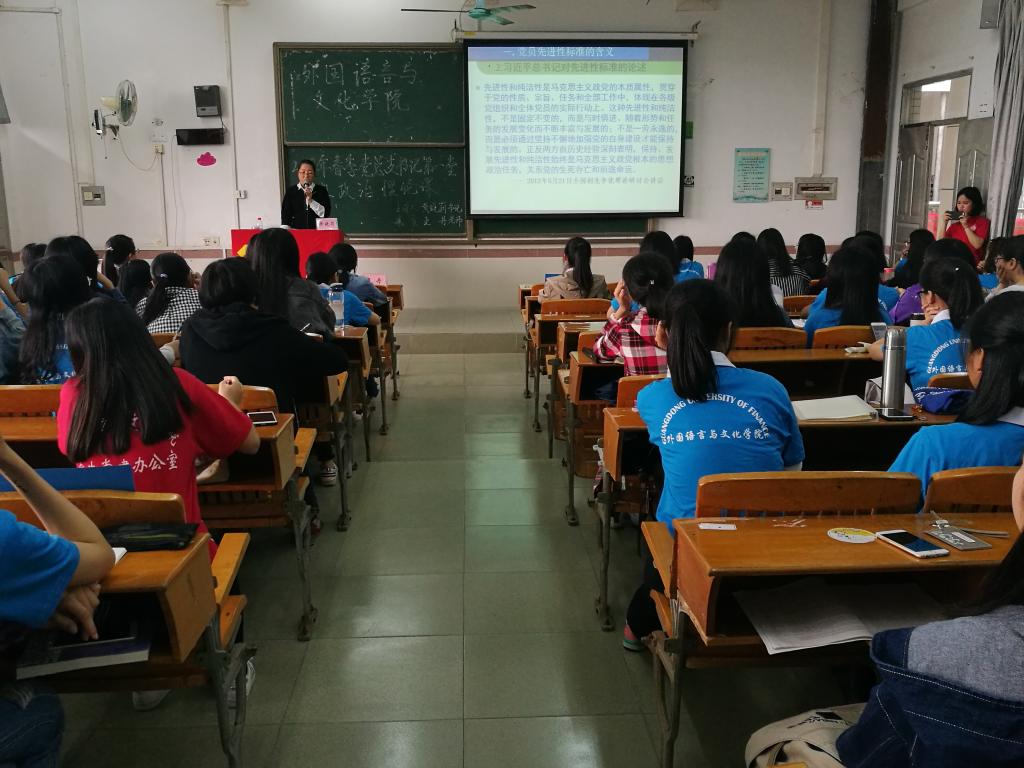 课堂上,黄晓莉书记以“坚定理想信念,践行社会主义核心价值观”为主题开讲,她通过阐述党员先进性的含义,带领同学们感知其重要性,在践行社会主义核心价值观的同时,要发挥党员的先进性和先锋模范作用。黄中习院长则围绕“解读十九大文件关键词英译,提升大学文化自信”开讲,让同学们在愉悦的氛围中加深了对十九大文件的认识、明白到自身努力的必要性,告诉大家应当关注国家社会的发展。