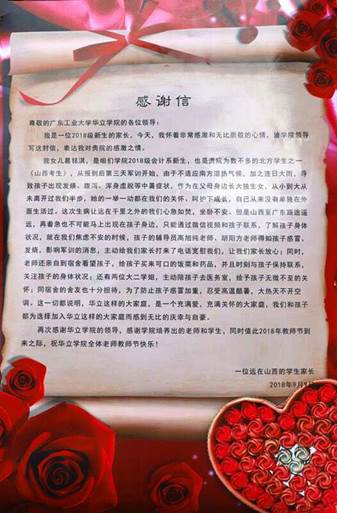 师姐:一开始新生来的时候我去看过他们,她一切都挺好的。军训的时候,因为她本来是外地的同学,不太适应广东的气候饮食各方面的,第一天她跟我说她肚子不舒服,一直跑厕所,我就跟她说去看校医。我下午一直跟她保持联系,不放心就去宿舍看她,她跟我说好很多了。后面她肚子好了,但还很虚弱,我就让她在旁边休息。她爸妈不放心就赶了过来。起初是我主动打电话给她妈妈,一是为了保证学生的安全,二是宽慰他们,免得他们过于担忧。自这件事之后,她的爸妈也常打电话给我,我们一直保持联系,可以说是成了好朋友呢,哈哈。说实话,我觉得我只是做了一个辅导员该做的事情,收到感谢信我挺惊讶的。