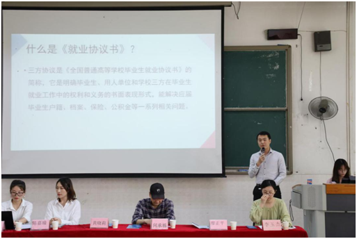 会上,廖正平老师就目前紧张的就业形势进行分析,提醒同学们早做准备,把握好每一个就业机会;讲解了签订《就业协议书》的注意事项,签订就业协议意味着同学们的第一份工作确定,签订前应仔细考虑不要随意违约;解读了毕业生择业期政策,解开同学们的疑惑;鼓励大家积极参加职业生涯规划大赛,并祝愿大家前程似锦!