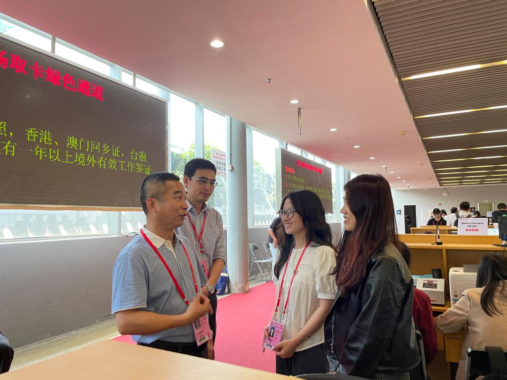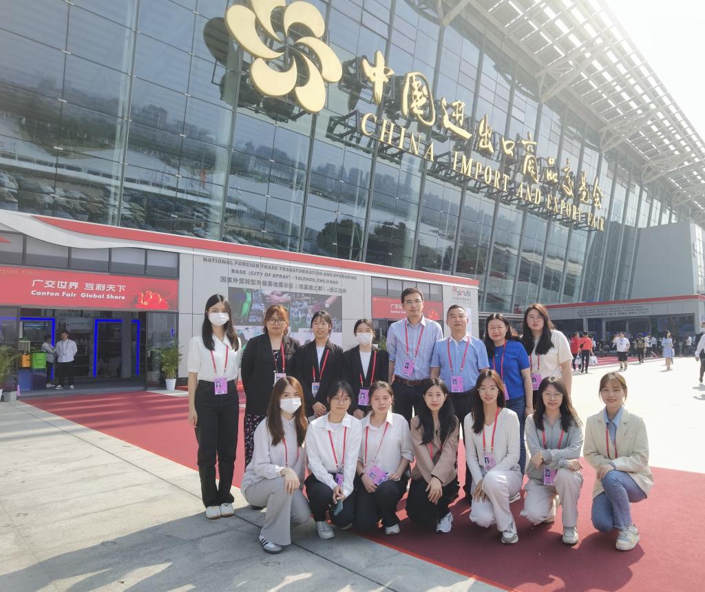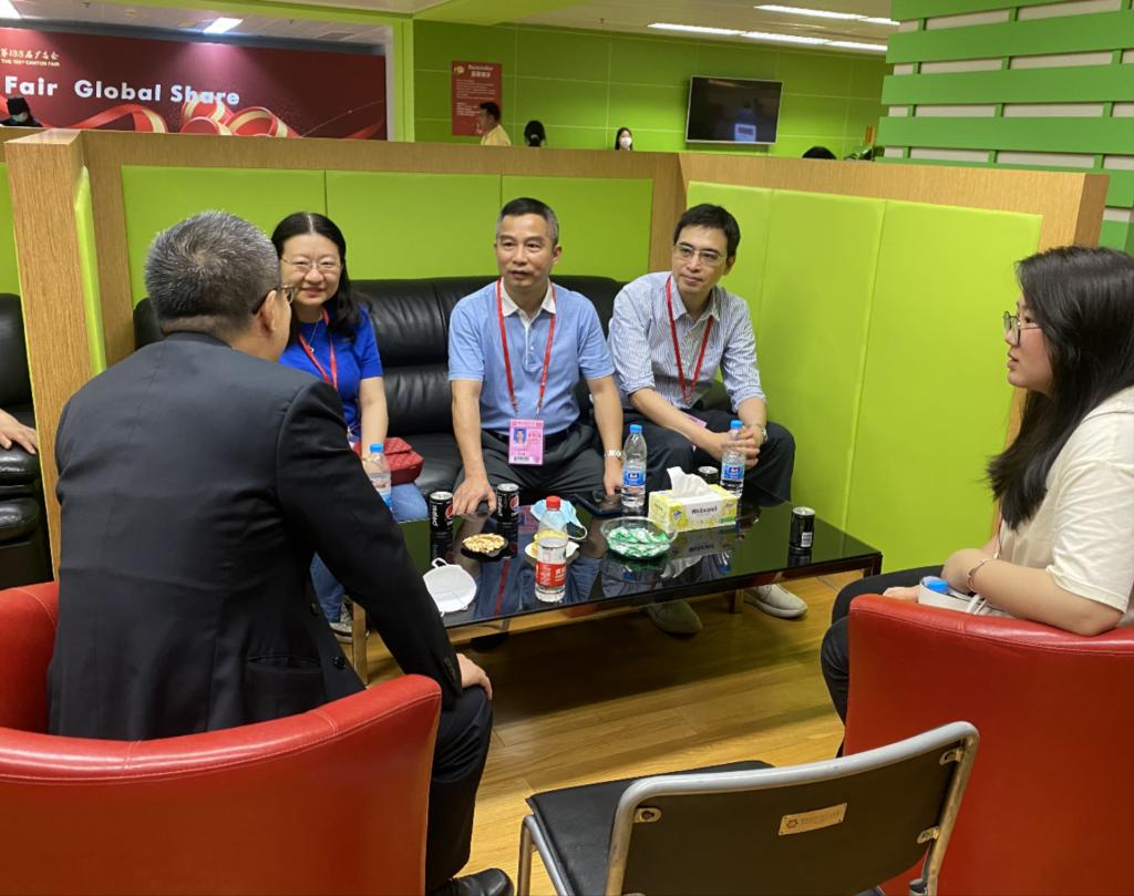 广州第133届交易会于4月15日隆重开幕,本届广交会beat365官网共派出107名2020级学生参加实习实践,负责境外采购商办证、咨询导向、展厅咨询、广交会调研、组展事务运营等多个岗位的工作。为深入了解学生在广交会岗位实习情况,调研企业用人需求,稳步推进校企合作,提升教育教学质量,促进学校高质量发展,4月17日下午,beat365唯一官方网站党总支书记黄庆雄、副书记王丹、副院长陈树坤、辅导员李春蓉一行4人到广交会琶洲展馆走访调研。