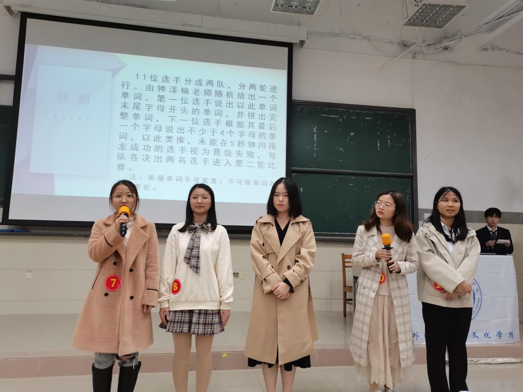 大赛第一环节,单词接龙。选手们根据钟泽楠老师给出的单词轮流接龙,他们口齿伶俐,妙语连珠,丰富的词汇量为他们的迅速作答提供了坚实保障。经过一场激烈的头脑风暴,肖凯欣、黎铭雯、林铭浩和陈梓颖四名选手成功晋级!