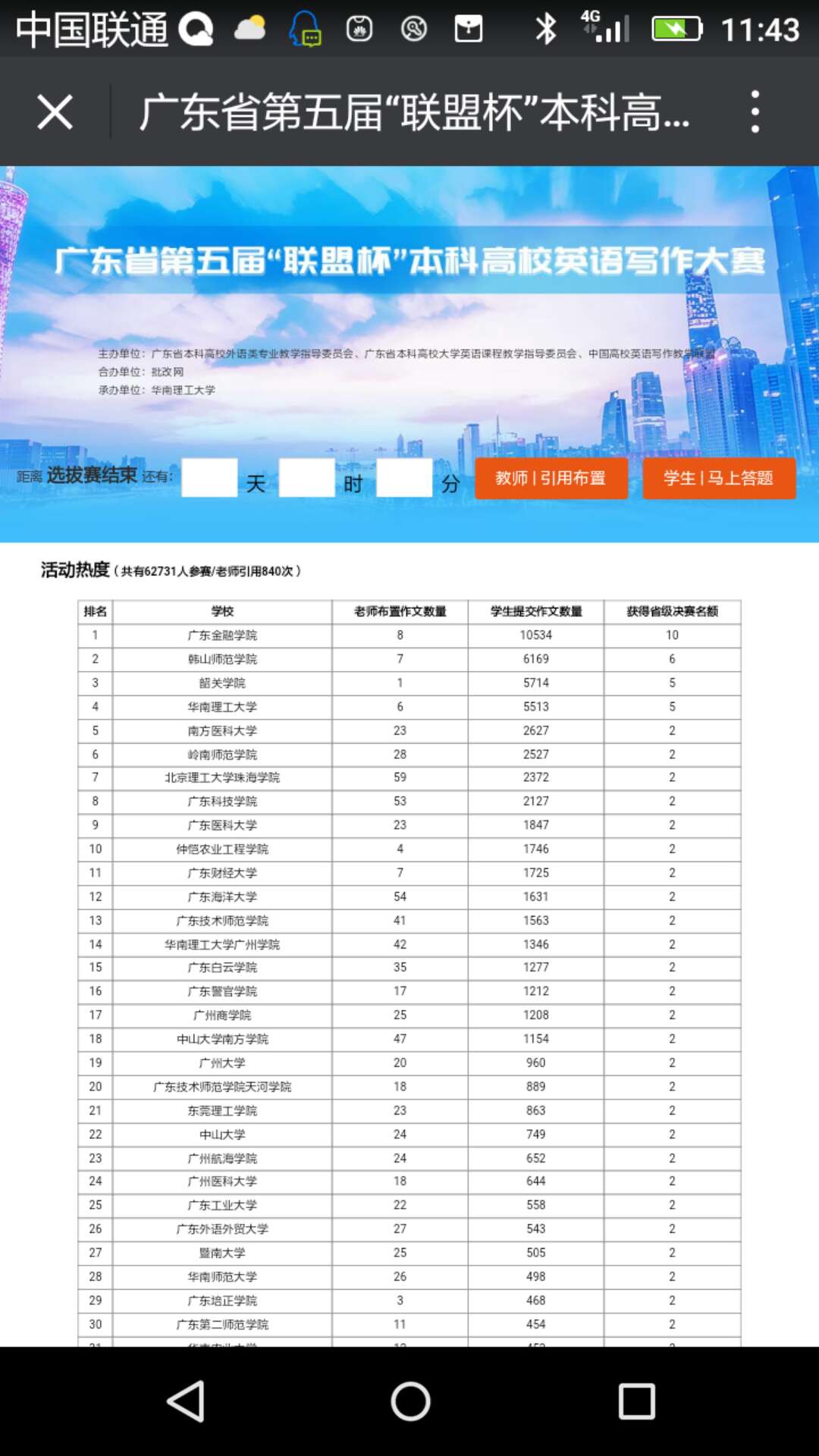 在本次写作活动中,广东省高校共有62731人参赛,其中我校学生提交的作文数量为10534篇,在广东省各高校的参与活动热度最高,并获得10个决赛参赛名额,份额最多。希望我校参赛选手再接再厉,在指导老师的指导下,争取发挥自己的最好水平。