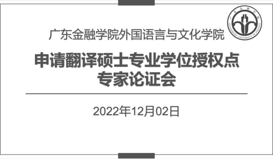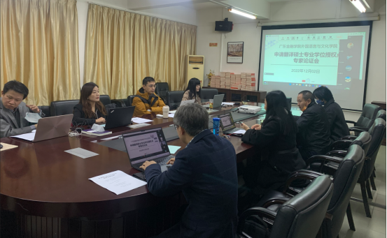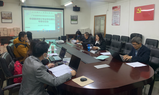 2022年12月2日上午,beat365官网举行申请翻译硕士(MTI)专业学位授权点专家论证会。学院邀请到中山大学王东风教授、广东外语外贸大学赵军峰教授、广州大学肖坤学教授以及我校校长雍和明教授,通过在线会议的方式,对申硕工作小组此前形成的申报材料“会诊”“把脉”,同时也邀请到我校研究生处卿前龙处长、郭丽梅副处长和陈晓莉老师莅临学院会议室作线下指导。
