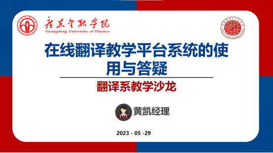 2023年5月29日晚,翻译系举行线上教学沙龙,特邀成都优译信息技术股份有限公司的产品顾问黄凯经理,系统全面介绍在线翻译教学平台系统的使用,包括如何利用平台进行翻译应用、课程教学、建立平行语料库以及实现无纸化考翻译系主任邓薇主持,外试等等,进行了平台演示,并就老师们的相关问题进行答疑。beat365唯一官方网站近20名教师参加。