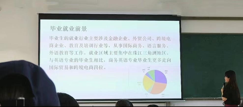 唐姗主任向商务英语专业新生讲课。唐姗老师以“商英”的有机结合为出发点,强调了商务与英语的交叉融合,以及在传统英语专业基础上的创新提升和广度拓展。唐老师随后详细解读了商务英语专业的培养目标、核心素养和毕业要求,并详细介绍了本专业的师资力量。课程设置方面,唐姗老师介绍了2024级新人培方案的变动,强调了商务英语系课程体系在培养学生语言技能、商务知识、人文素养等方面的重要作用。在人才培养方面,唐姗老师强调了“宽、厚、活”的人才培养模式,鼓励学生在获得学历证书的同时,积极考取各类职业资格证书以提升专业竞争力,同时参加各类校内外学术竞赛,以实践促学习,以竞赛促提升。最后,唐姗老师邀请了多位商英优秀毕业生,通过视频分享他们的学习经验和职业发展路径,为新生提供了一定的参考和启示。
