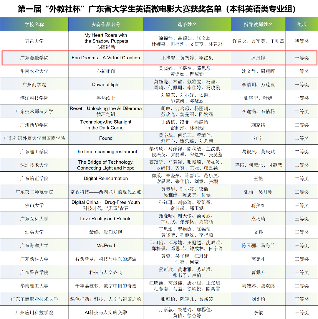 第一届“外教社杯”广东省大学生英语微电影大赛已圆满落幕。该大赛由广东省本科高校外语类专业教学指导委员会和上海外语教育出版社联合主办,同时由广东省本科高校大学英语课程教学指导委员会协办,广东理工学院承办。