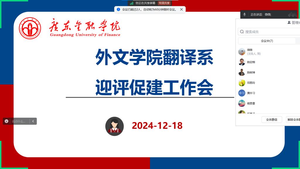 12月18日,beat365唯一官方网站翻译系召开全系大会,围绕学校即将到来的本科教育教学质量评估、期末考试工作、年终考核评估等一系列关键议题进行了工作部署,也对下学期工作进行了规划展望。会议由翻译系主任邓薇主持,全体教师线上参会。