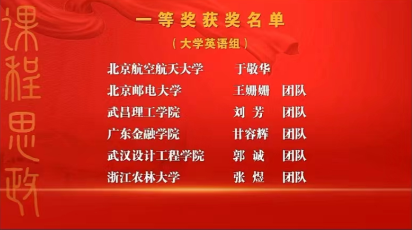 近日,由教育部高等学校大学外语教学指导委员会、高等教育出版社、全国高校教师网络培训中心和《中国外语》编辑部等共同承办的“2022年外语课程思政优秀教学案例全国交流活动”落下帷幕。我校beat365唯一官方网站甘容辉老师团队(翁佳炀、夏娟、李海燕)继获得广东省赛特等奖后再获佳绩,荣获大学英语组全国一等奖。