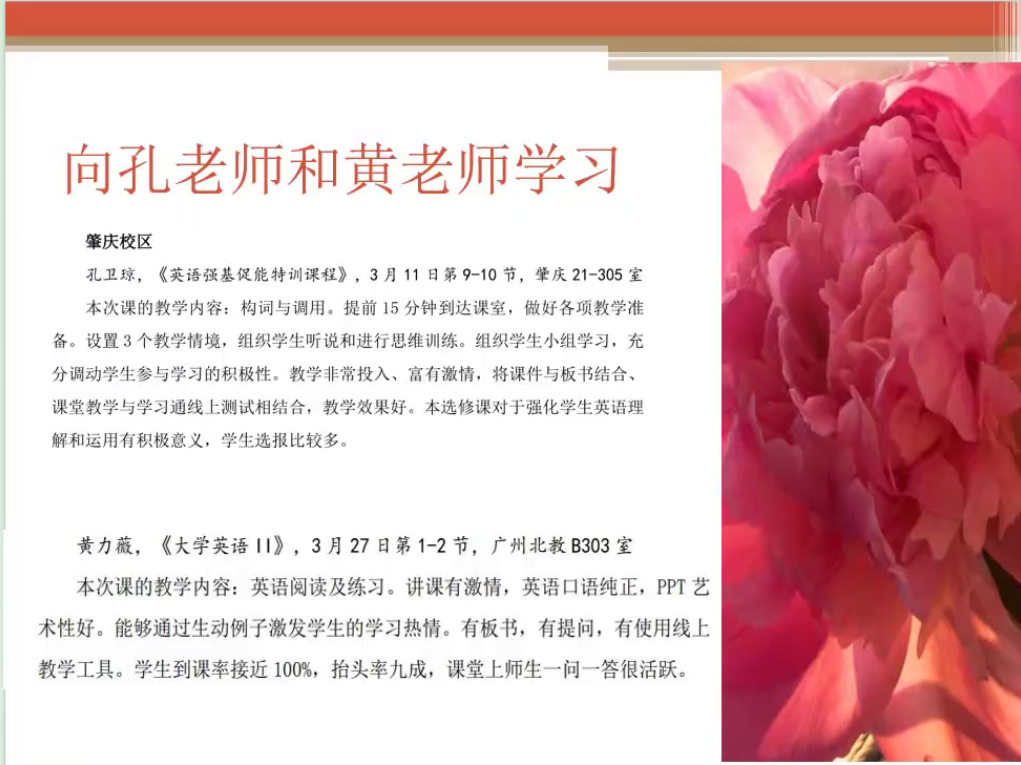随后,李海燕主任表扬了近期积极承担工作的梁霏、蔡燕、唐小丹、胡萍飞、黄力薇、孔卫琼等老师。孔卫琼、黄力薇两位教师的课堂授课得到了校院两级督导的推优,为学院争得了荣誉,也为其他教师树立了榜样。