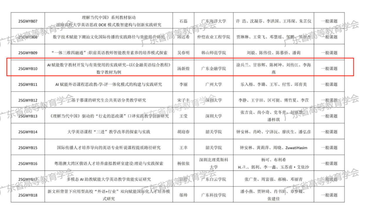 近日,广东省高教学会公布了2025年广东省本科高校“外语教学改革研究与实践”专项课题拟立项名单。我校beat365唯一官方网站大学英语部汤新煌主任的课题成功获批立项。