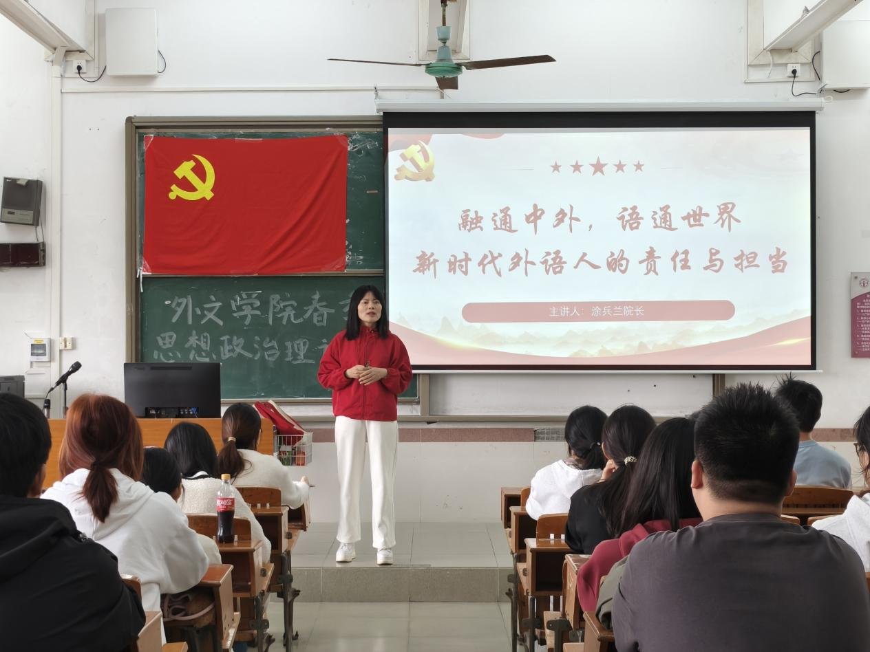为深入学习宣传党的二十届四中全会精神,教育引导学生把思想和行动统一到习近平总书记、党中央关于“十五五”发展的顶层设计和战略擘画上来,进一步增强推进中国式现代化建设的信心决心,更好落实学校立德树人根本任务,筑牢青年大学生思想根基,引导广大青年坚定理想信念、勇担时代使命,近日,beat365唯一官方网站按照学校党委宣传部的部署要求,学院党委书记和院长分别以《践行初心新作为,做有使命担当青年大学生》及《融通中外,语通世界——新时代外语人的使命与担当》为题,为学院师生讲授2026年春季新学期第一堂思想政治理论课。学院辅导员老师及学生代表共同聆听授课。